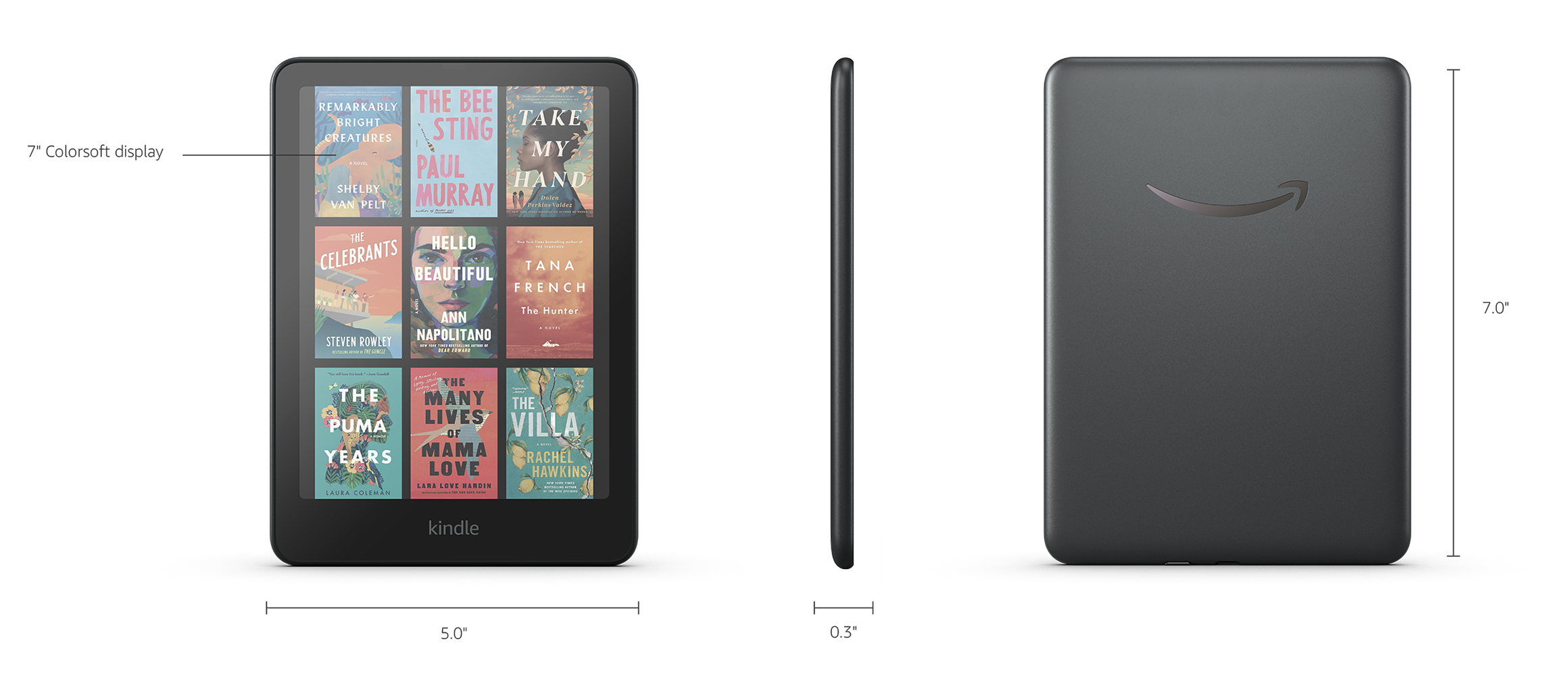 Amazon’s 7” Colorsoft display technology with built-in light, 300 ppi B&W, 150 ppi color, optimized font technology, 16-level gray scale. |