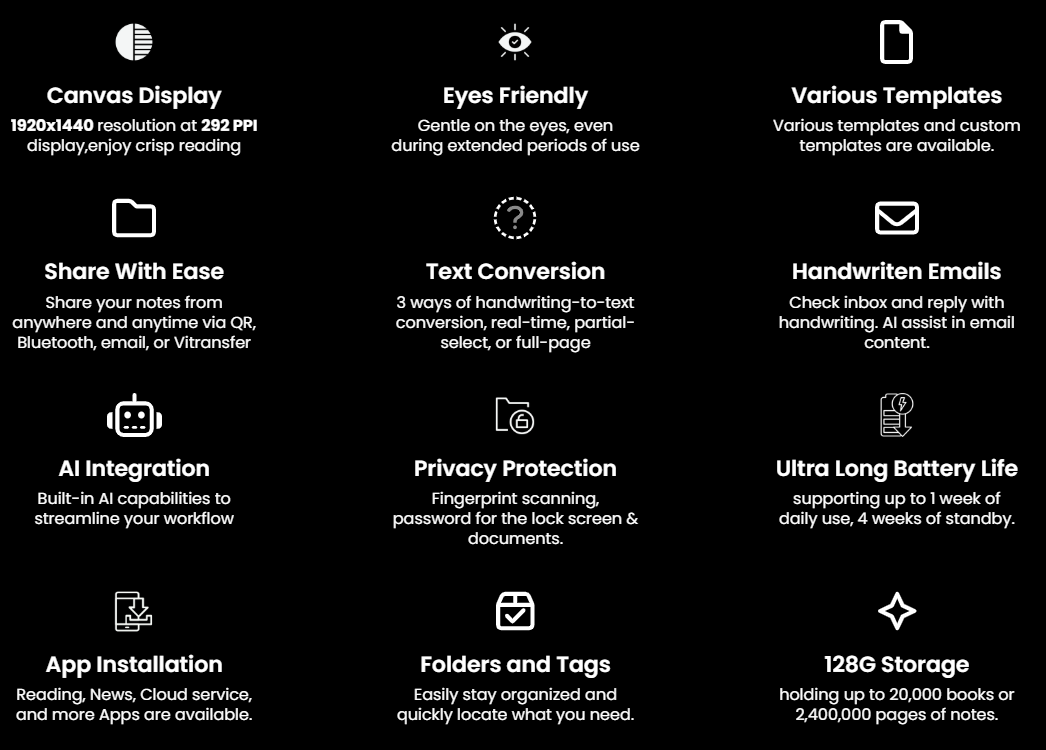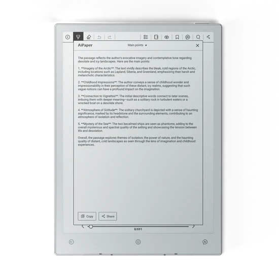The AiPaper Mini features an 8.2-inch E-Ink display, providing a crisp, glare-free reading experience, and smooth page turning, just like natural paper.
